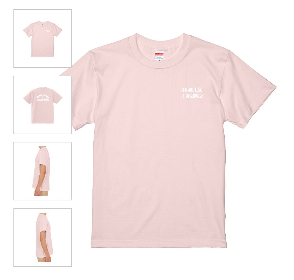 サイズはS、M、L、XL 色はベビーピンクです。 薄すぎず、厚すぎず、肌触りの良い質感のTシャツです。皆さんの応援のおかげでハロージーザスフェスティバルを5年間続けてくることができた感謝と記念に作りました!